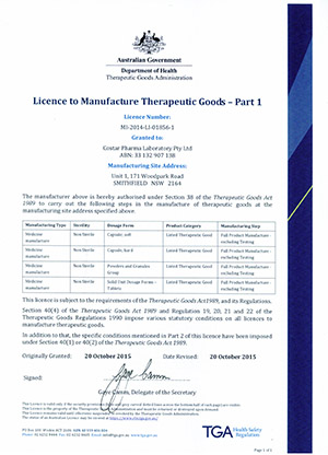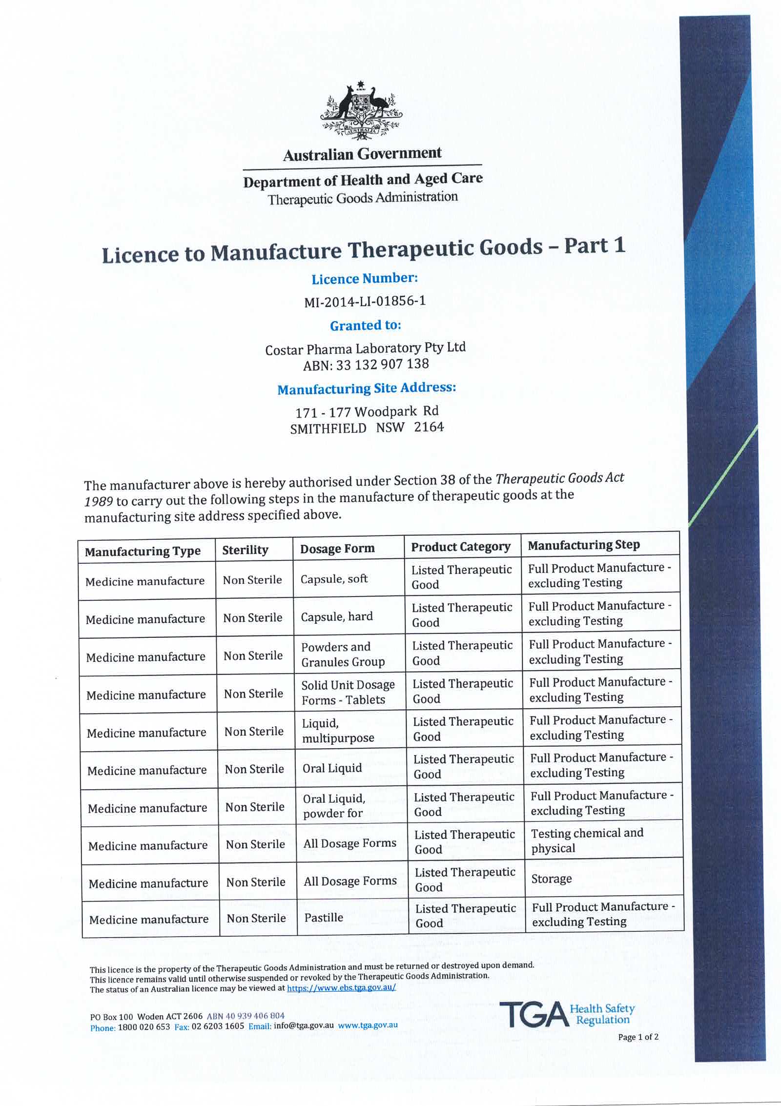 1. TGA Licence for Non-Sterile Medicine Manufacture of Tablets, Hard Shell Capsules, Soft Gel Capsules, Powders and Granules.