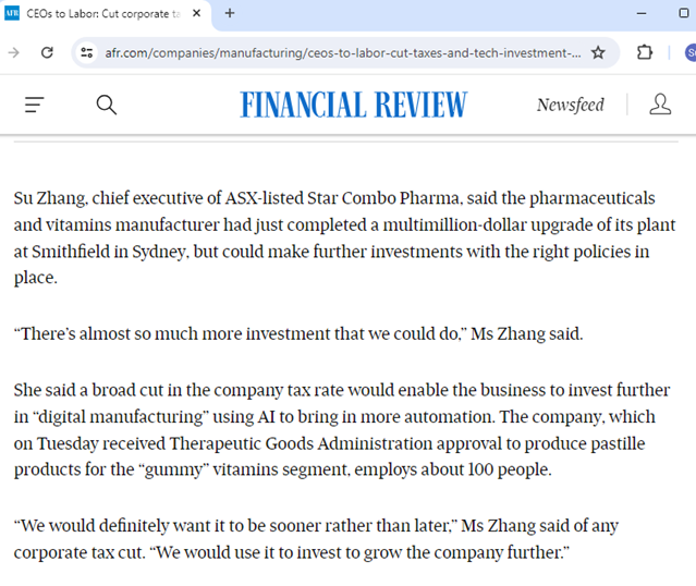 In the Interview, Ms Su Zhang announced a multimillion-dollar upgrade to their Sydney plant and expressed that a corporate tax cut would enable further investments in AI-driven digital manufacturing. The company, which employs about 100 people, recently received approval to produce gummy vitamins and aims to expand further with the right policies.